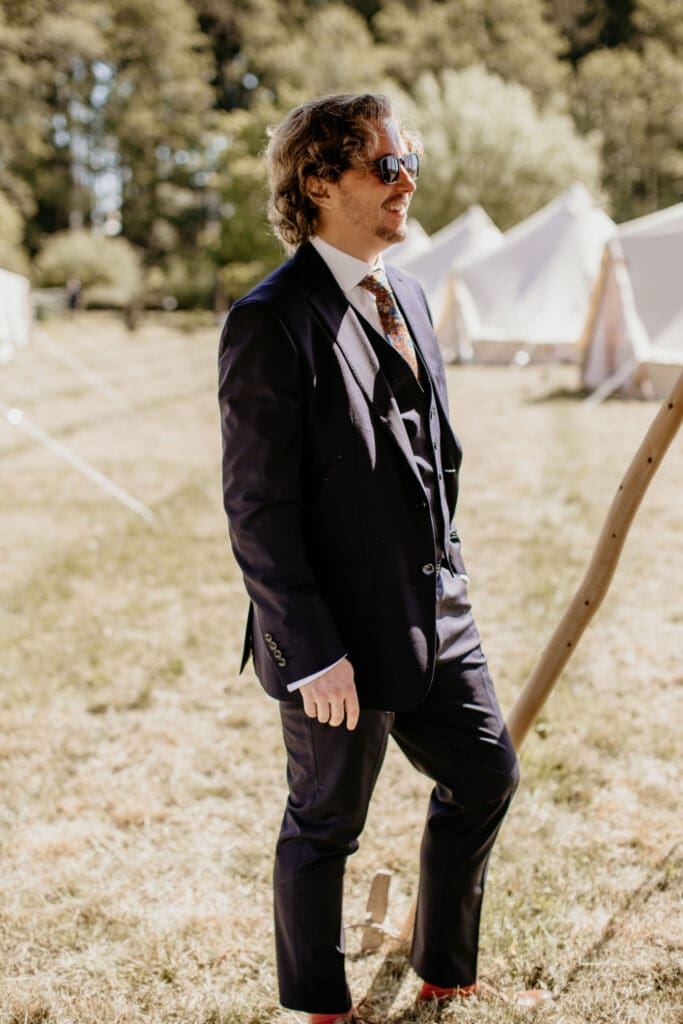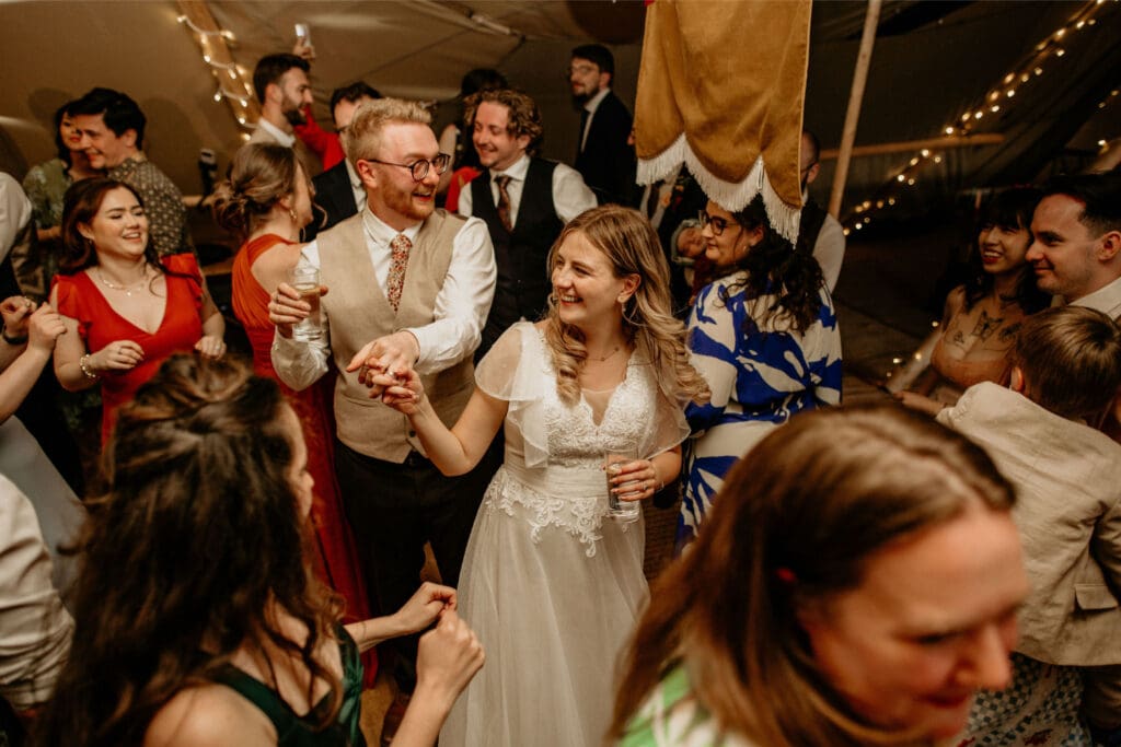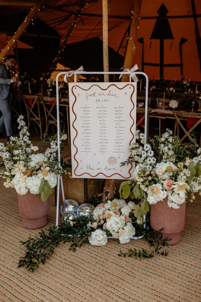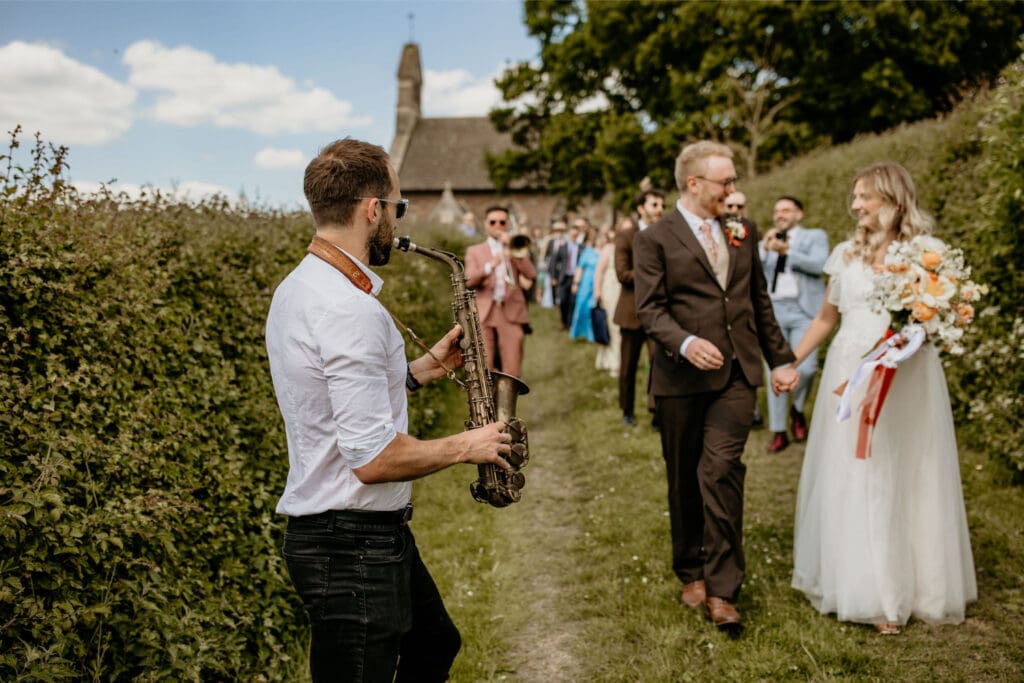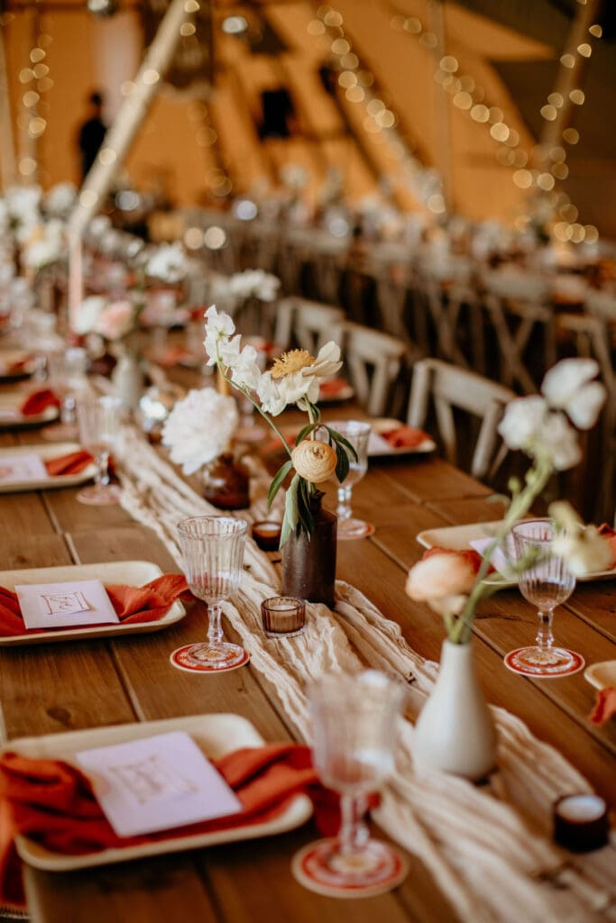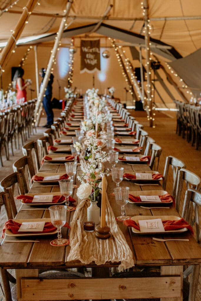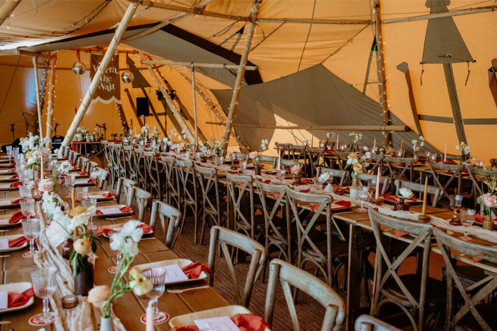 The atmosphere was elevated even further by the incredible Supertonic band, with live trombone and sax serenading guests from the church to the tipis for the arrival drinks-yes it was as epic as it sounds. And just when you thought it couldn’t get any better, the evening turned into an intimate acoustic set for the final hour, with guests joining in-led by the guitar-playing groom himself. A celebration that was equal parts stylish, soulful, and completely unique.